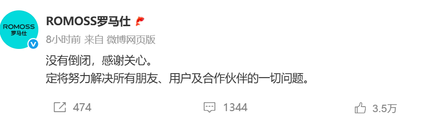 当晚11时50分许,罗马仕官方微博发布消息称:“没有倒闭,感谢关心。定将努力解决所有朋友、用户及合作伙伴的一切问题。”